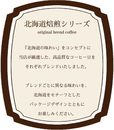 北海道の味わいをコンセプトに当店が厳選した高品質なコーヒー豆をそれぞれブレンドいたしました。ブレンドごとに異なる味わいを、北海道をモチーフとしたパッケージデザインとともにお楽しみください。